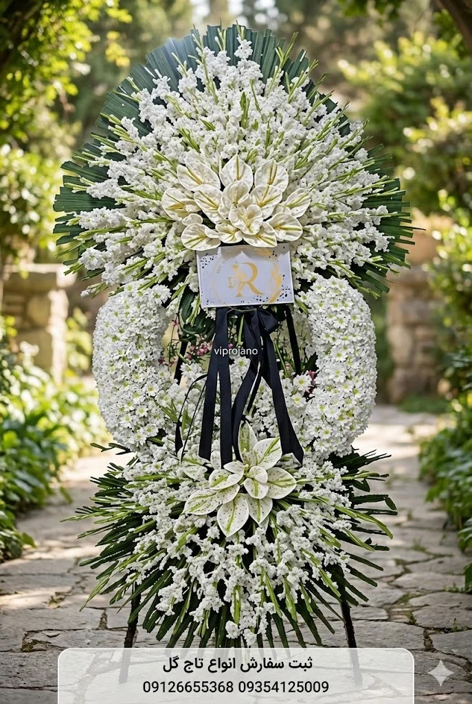 تاج گل مهر، انتخابی باشکوه، زیبا و با احترام برای مراسم ترحیم، ختم و یادبود عزیزان شما. سفارش آنلاین یا تلفنی در VIP Rojano با ضمانت کیفیت و ارسال فوری.