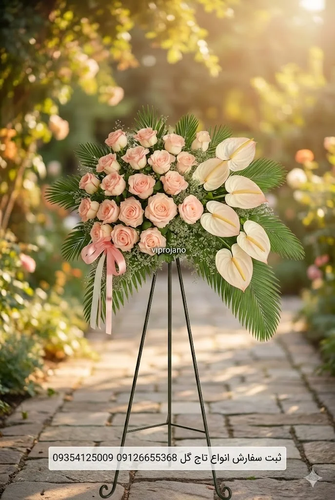 تاج گل نمایشگاهی فانتزی روشنگر با ۶ شاخه آنتوریوم و ۴۰ شاخه رز هلندی، طراحی شده روی پایه فلزی محکم با ارتفاع ۱۲۰ سانتی‌متر. مناسب ختم‌های کوچک، مجالس خانوادگی و یادبود با ارسال فوری در تهران.